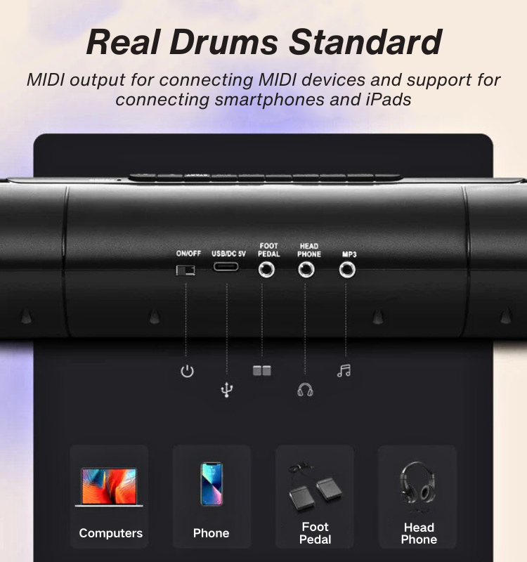 | Functions: | With Built-in Speakers, With Built-in Batteries; Drum style switch, Record&Play, Bluetooth, DTX Gaming, Dual Stereo Speaker; Crash Cymbal, Ride, Hi-Hat, High Drum, High Tom, Low Tom, Bass Drum, Floor Tom; Best gift for kids; Good for music talent cultivate; Safe boot-grade material |